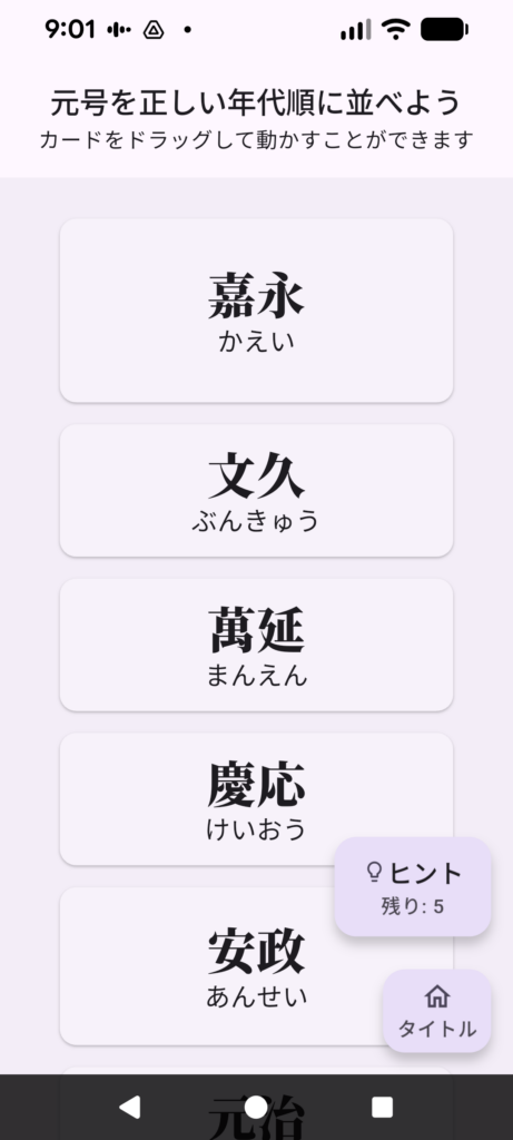 「戦国・江戸元号並べ」は、戦国時代から江戸時代の元号(年号)カードを、正しい順に並べ替えていくうちに、当時の歴史、人物、元号に馴染みができるアプリです。