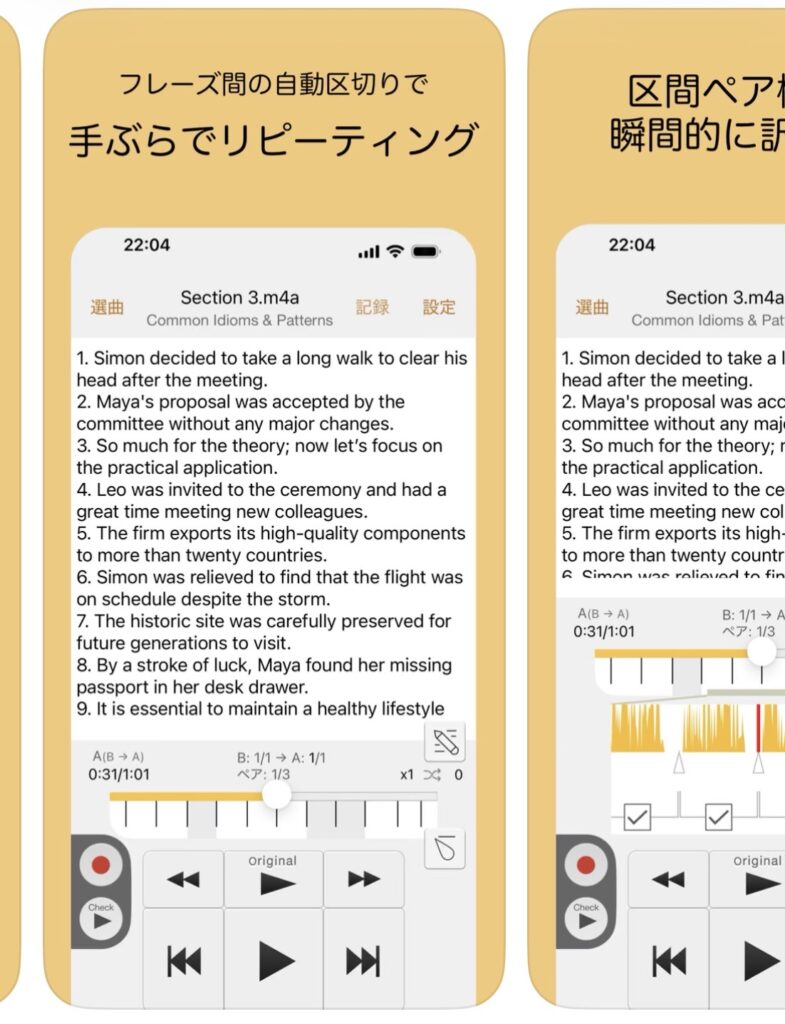 無音部分を自動認識し、語学教材をフレーズごとに間隔をあけて再生できます。